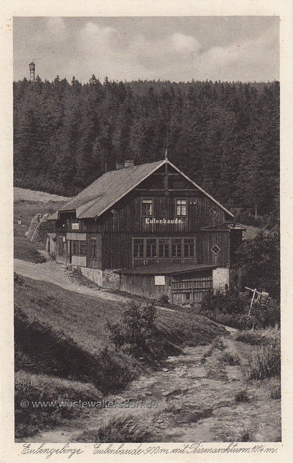 Dies war jedoch nicht immer so. In weit zurückliegenden Zeiten gab es an der Kreuzung Kaiserweg-Turmweg einen Kretscham, eine "Eulenschänke", die jedoch abbrannte. Damals mußten die noch wenigen Eulenkammbesucher dann auf der Eulenwiese den Kaffee selbst kochen, oder ganz darauf verzichten. Als 1882 der Eulengebirgsverband gegründet wurde, machte sich die fehlende Rastmöglichkeit stark bemerkbar. Da stiftete ein Freund der Berge, der Vorsitzende des Eulengebirgs-Vereins (EGV) Wüstewaltersdorf, Fabrikbesitzer Carl Wiesen, im Jahre 1895 in die höchste Kolonie - in der früheren Eulenburg -, später Euledörfel genannt, in 860 m Seehöhe, ein größeres Grundstück zur Errichtung einer Schutzhütte. Diese wurde 1896/97 erbaut.. ....(1)<<